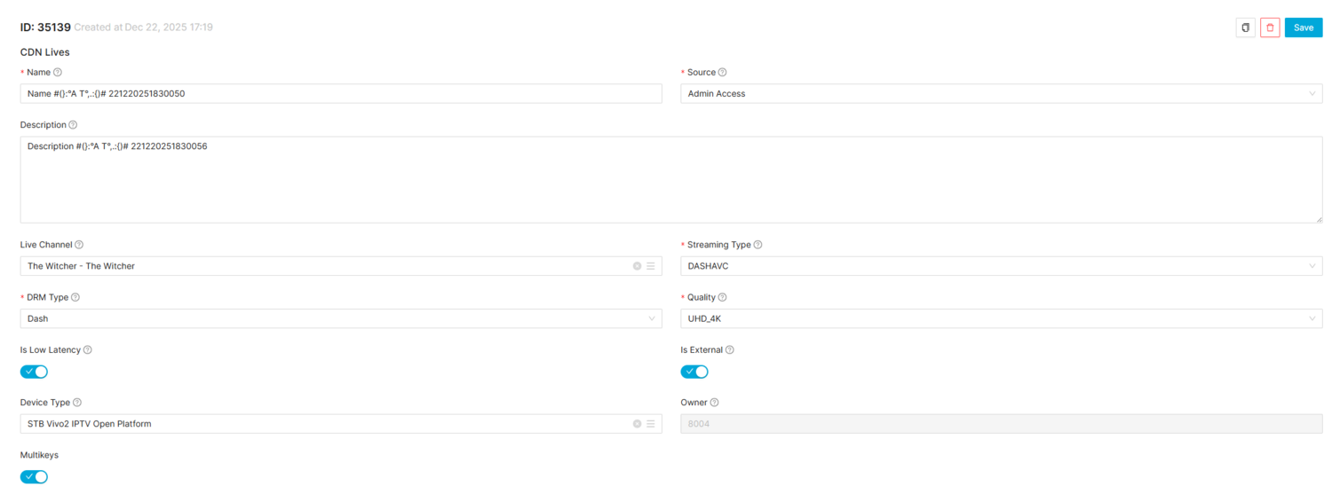 | Device Type | Allows to define this CDN Live for an specific Device Type. Null / Empty will mean that this CDN Live will be available for all device types | - |