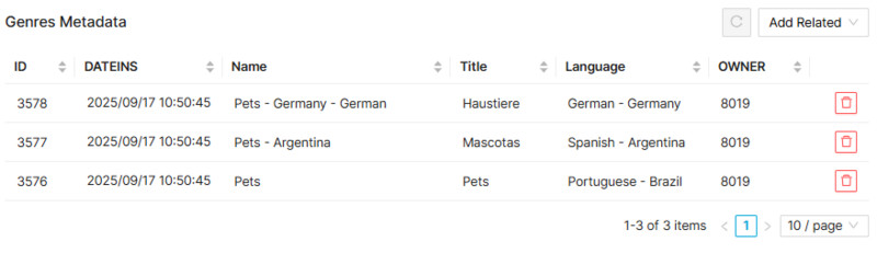 A genre has a single name and multiple metadatas depending on the language. This block allows to manage these metadatas for each langugage associated to a genre. A genre metadata is composed of the following fields: