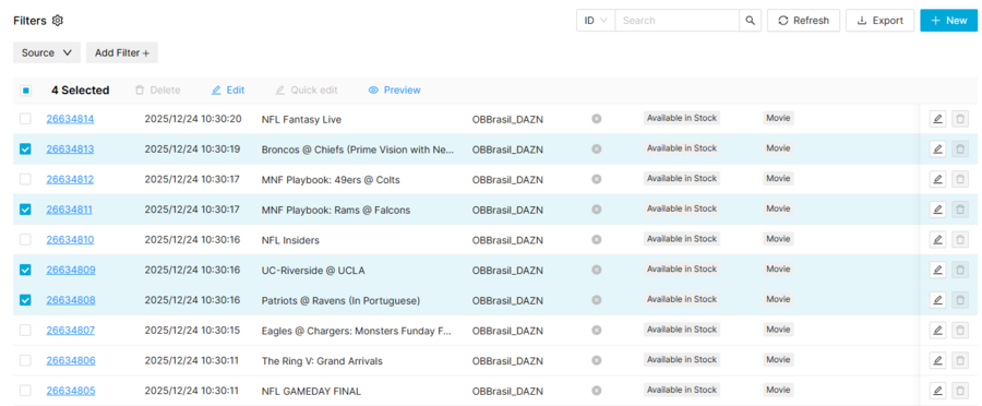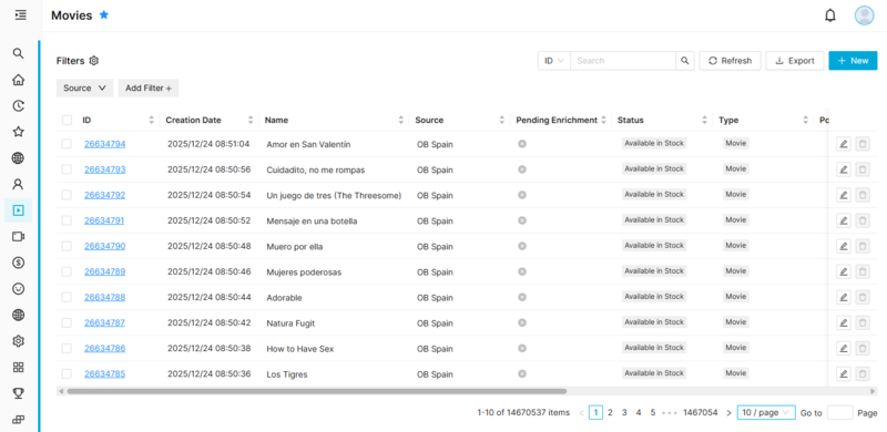 When you access to a menu, you will first arrive to the List Page, where you will be able to browse over the menu items you have access to (for example, the list of movies). The access to the different items on the list is controlled through the Source field. You will only be able to access those items that belong to the Sources where you have access.