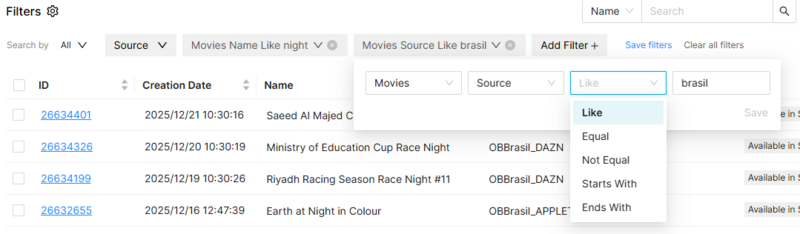 • Text fields have: Like, Equal, Not Equal, Starts with, Ends with.