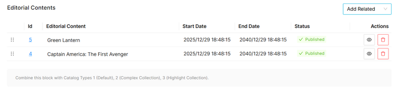 button and a dialog will open to select and existing Editorial Content. If you want to create new Editorial Content, it is not possible to do it from this page, you will need to go to the Editorial Contents page. - It is possible to edit the Start Date and End Date.