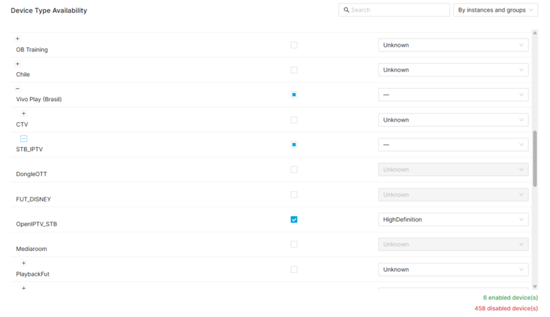 - Instance level: The first level groups all the device availabilities for an instance. It can be used to enable/disable the availabilities and configure the quality for all the device types at the same time. In a VOD Channel, it is not possible to create availabilities for different instances. It is just possible to create availabilities into the instance the VOD Channel belongs to. The instance is calculated based on the VOD Channel parent channel, until recursively reaches a root channel that will be linked to an Instance.