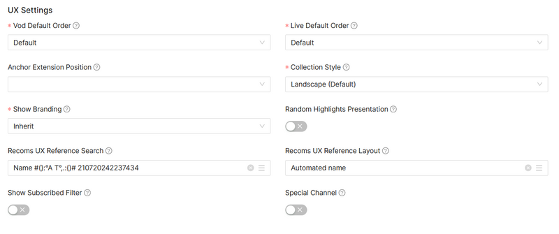 | Recoms UX Reference Search | Indicates the recommendation engine UX reference that will be used when showing inner contents when navigating to the VodChannels | - |